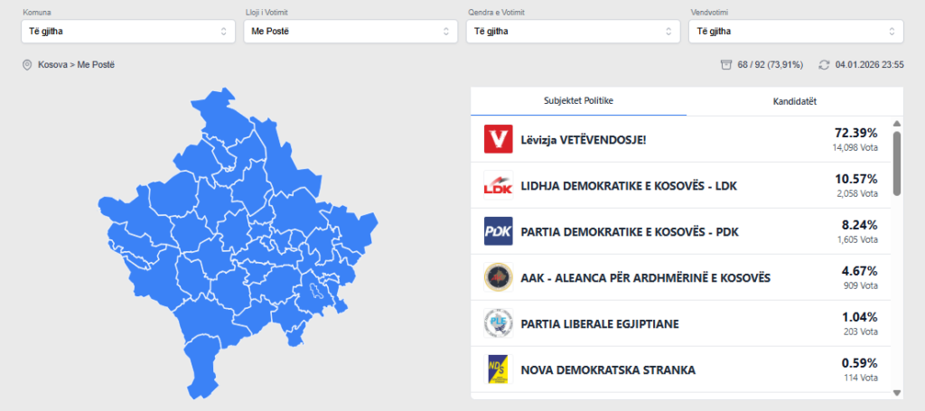 Janë numëruar mbi 73% e votave me postë, ku Vetëvendosje vazhdon të jetë larg partive tjera.