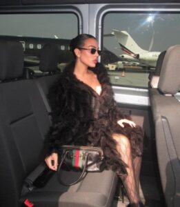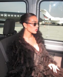 Për fotot e mëvonshme, ajo u mbulua me një pallto të zezë me lesh dhe shtoi syze të mëdha stilore në pamje.